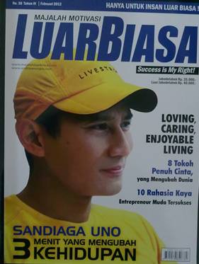 Profil Sandiaga uno tentang 3 menit yang mengubah kehidupan, 8 tokoh penuh cinta yang mengubah dunia, 10 rahasia kaya yakni enterpreneur muda tersukses, Money tips, Career tips, Health tips semuanya ada dalam majalah motivasi edisi bulan ini.