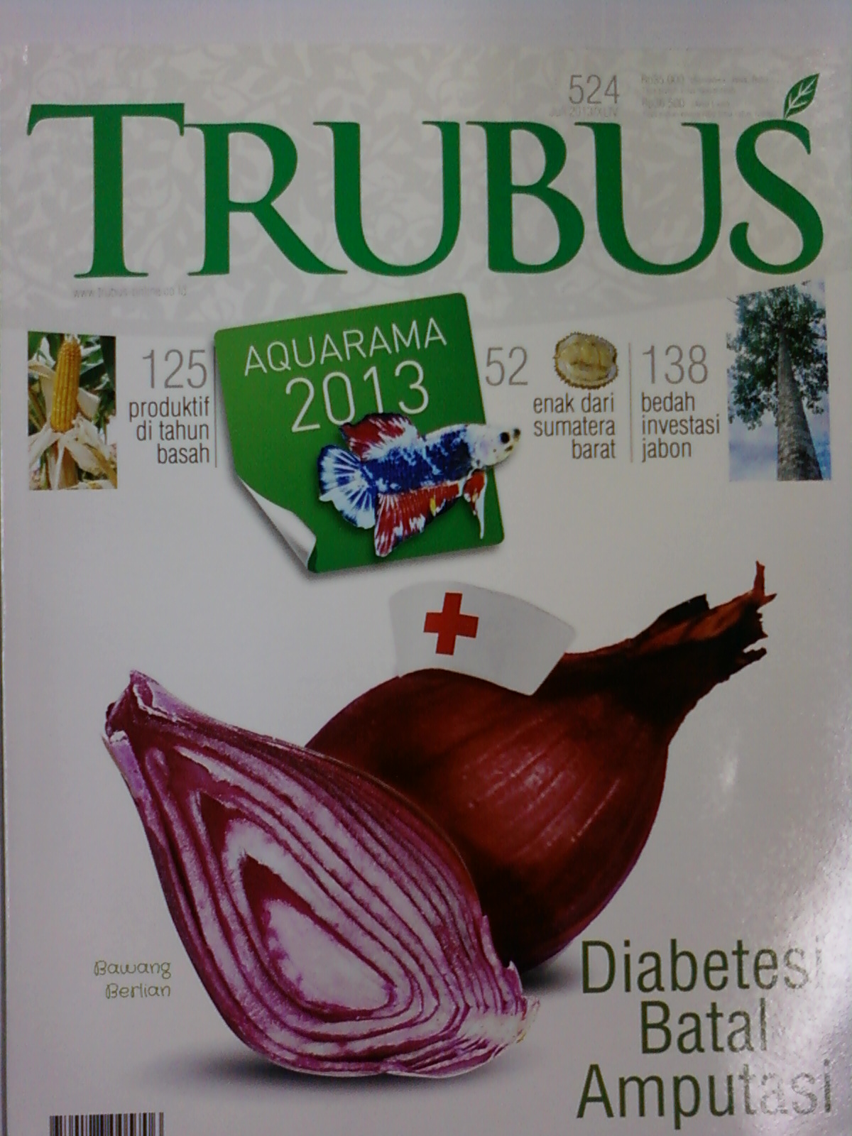Bawang Berlian menjadi foto sampul dalam Trubus edisi bulan Juli ini. Di edisi ini diulas tentang kesahihan bawang dayak mengontrol kadar gula darah, dilengkapi riset terbaru dari berbagai lembaga yang menegaskan bahwa bawang sabrang bersifat hipoglikemik. Selain itu ada artikel tentang cara aman konsumsi bawang berlian dan pendapat para dokter tentang khasiat bawang berlian. Laporan utama itu disandingkan dengan liputan khusus ke ajang pameranikan hias dunia dua tahunan di Singapura, Aquarama 2013. Tak lupa sajian tentang bedah investasi jabon yang kini tengah marak di berbagai daerah.